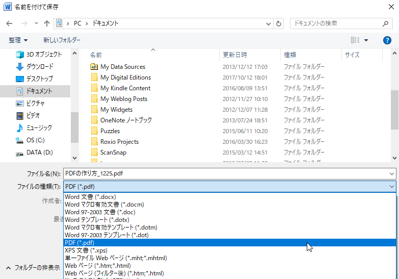 Wordの名前を付けて保存でPDFを選択する画面
