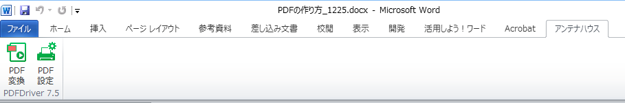 主要なPDF プリンタードライバーはMicrosoft WordなどのOffice製品にインストールするとWordの画面にアドインメニューを登録します。そして、アドインのボタンをクリックしてPDFを作成できる機能を用意しています。