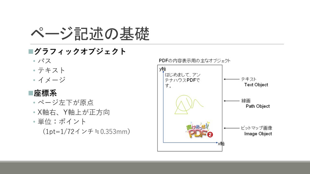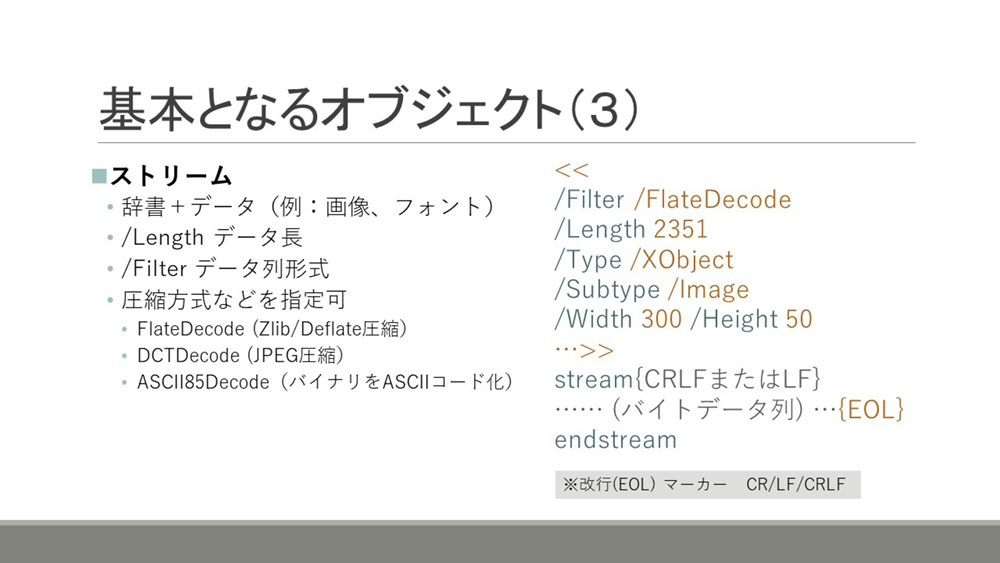 PDFファイルのフォーマットの構造や、フォーマットの理解に必要な基本的な概念について解説しました。