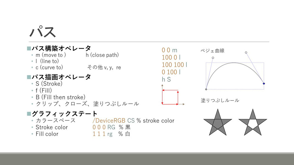 パスの記述には、パスの形状を定義するパス構築オペレータと、線を引く、塗りつぶすといった描画方法を指定するパス描画オペレータの2種類のオペレータがあります。下の図の例にあるように、矩形や曲線などを描くことができます。