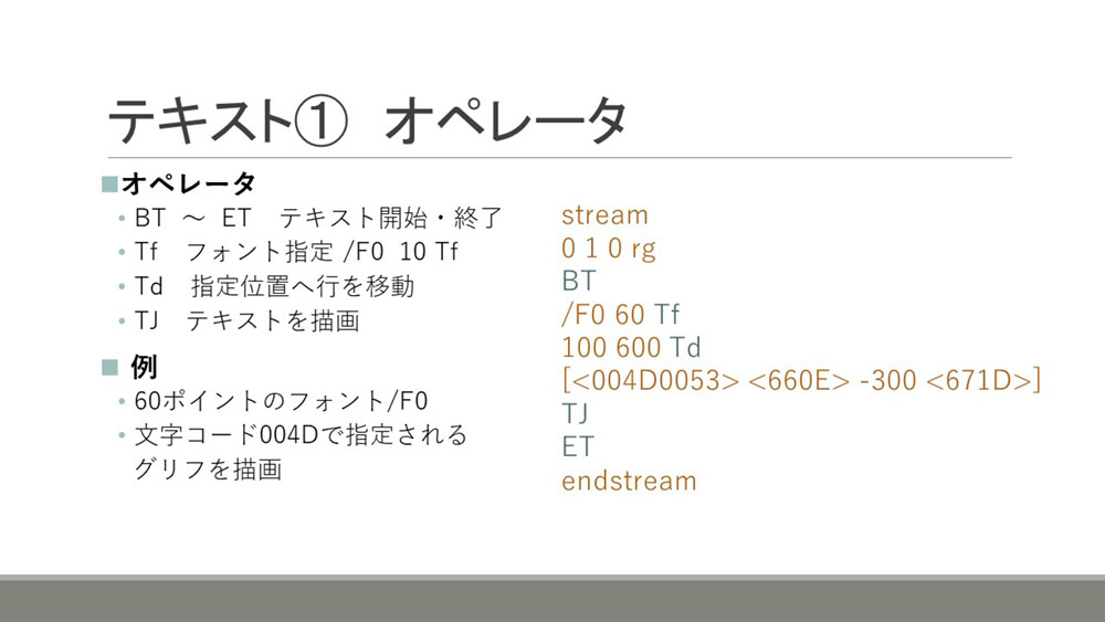 テキストは開始、終了のタグでくくって記述します。テキストの記述には、フォント指定や、行の開始、文字コードを指定してテキストを描画するオペレータなどがあります。