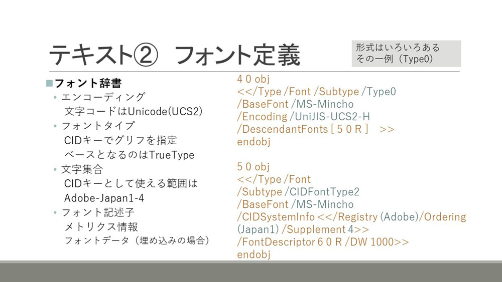 フォントについてはいろいろ形式があり複雑なので概要になりますが、エンコーディングと呼ばれるコンテンツの文字コードをCIDキーという形式に対応付けるような構造や、フォントのタイプ、文字集合、フォント記述子というような構造を、辞書を使って記述していきます。