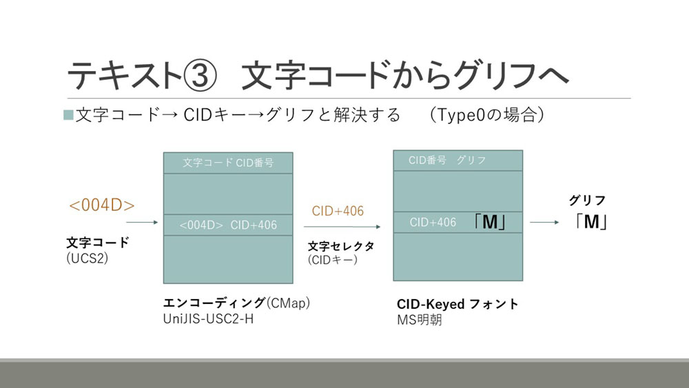 大まかな仕組みとしては、コンテンツにある文字コードからエンコーディングを使ってCIDキーという文字を表すキーに変換し、その中からフォントの中のグリフを指定するというような構造になっています。