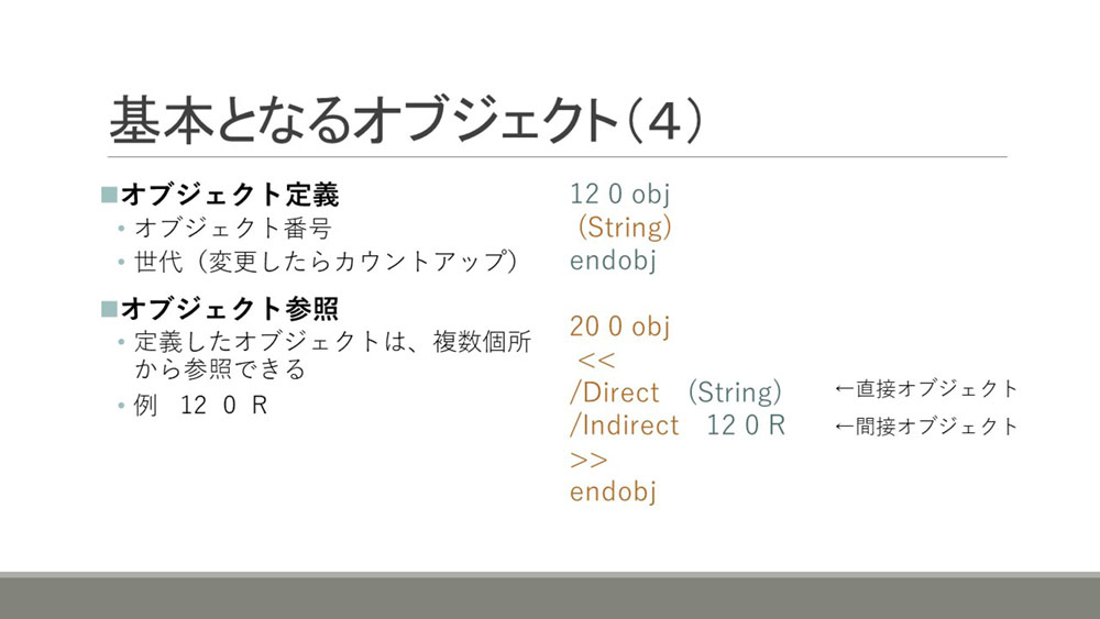 オブジェクトにはその場所で直接定義する直接オブジェクトと、参照を示す間接オブジェクトという区別があります。