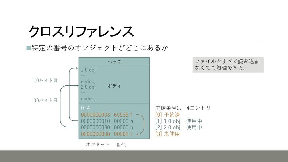 クロスリファレンスは特定の番号のオブジェクトがファイルの中のオフセットのどの位置にあるかということを示す構造です。次の図の下の部分がクロスリファレンスです。