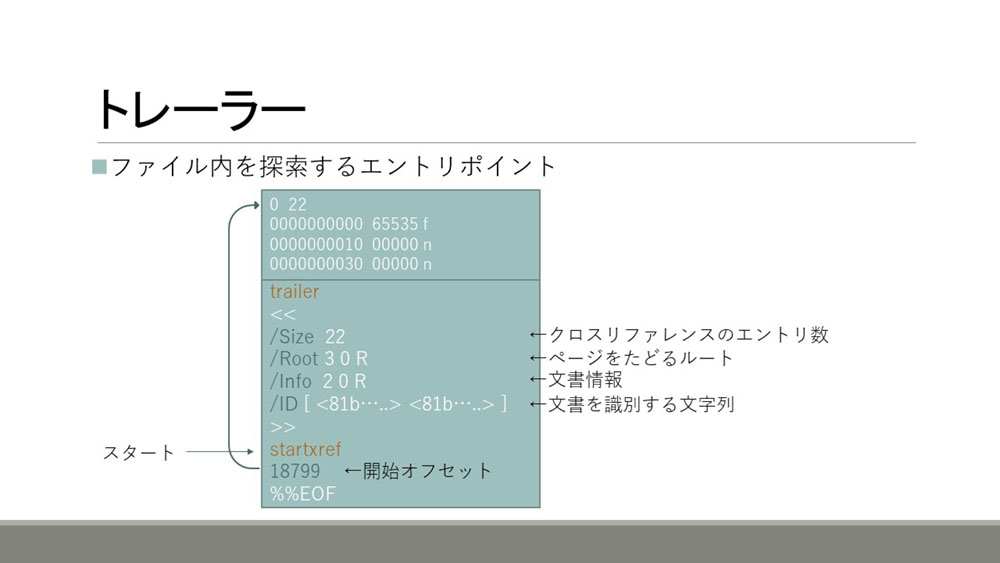 一番重要なのはRootのキーです。ここで示されているオブジェクトからPDFファイル内のデータをいろいろ辿っていく形になっています。その下にはstartxref(スタートクロスレフ)にクロスリファレンスのフィールドが始まるオフセットが書かれています。