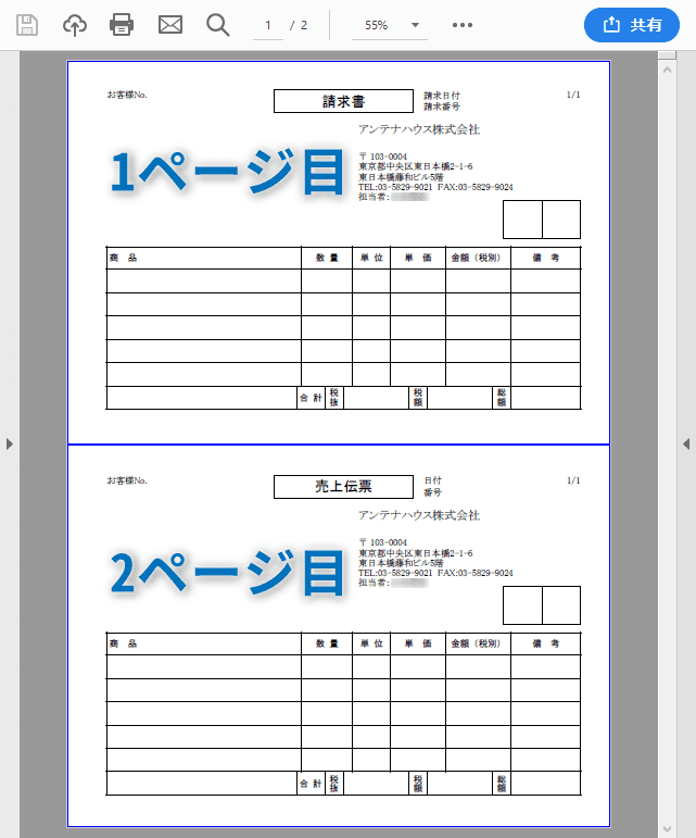 まずは、データを差し込む土台となるPDF(用紙PDF)を用意します。ここでは、「請求書」ページと「売上伝票」ページで構成されるフォーマットPDFを例に進めていきます。