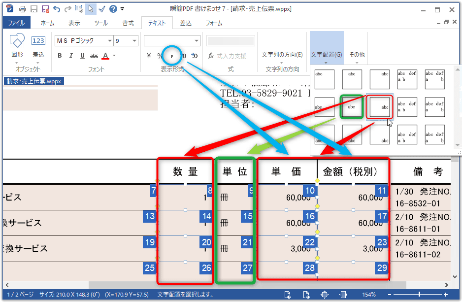 下図は、数の欄である「数量」「単価」「金額(税別)」の文字配置を、「上下中央・右寄せ」(赤枠)にし、「単位」欄を「上下中央・左揃え」から「上下左右中央揃え」(緑枠)に設定しようとしている様子です。