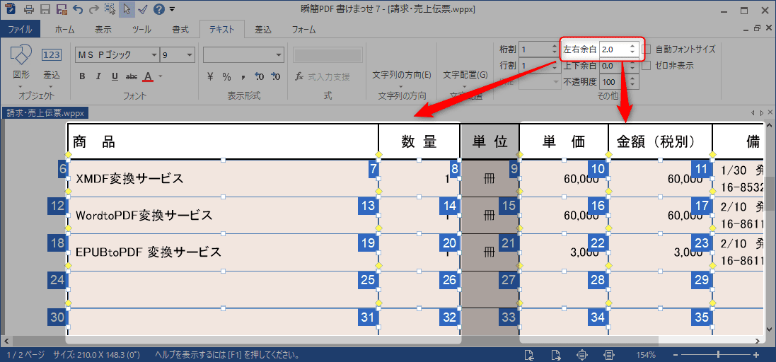 「単位」欄を除く全ての差込フィールドを選択し、[テキスト]タブ―[その他]カテゴリより、「左右余白」のリストボックスに任意の数字を入力します。ここでは、「2.0」を設定しています(下図)。