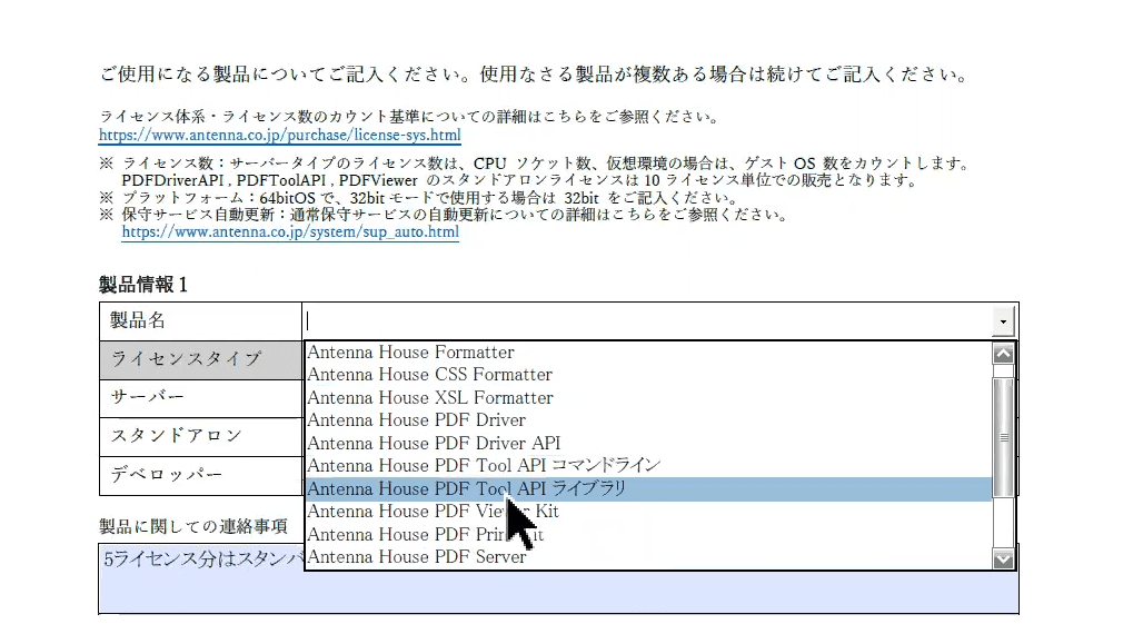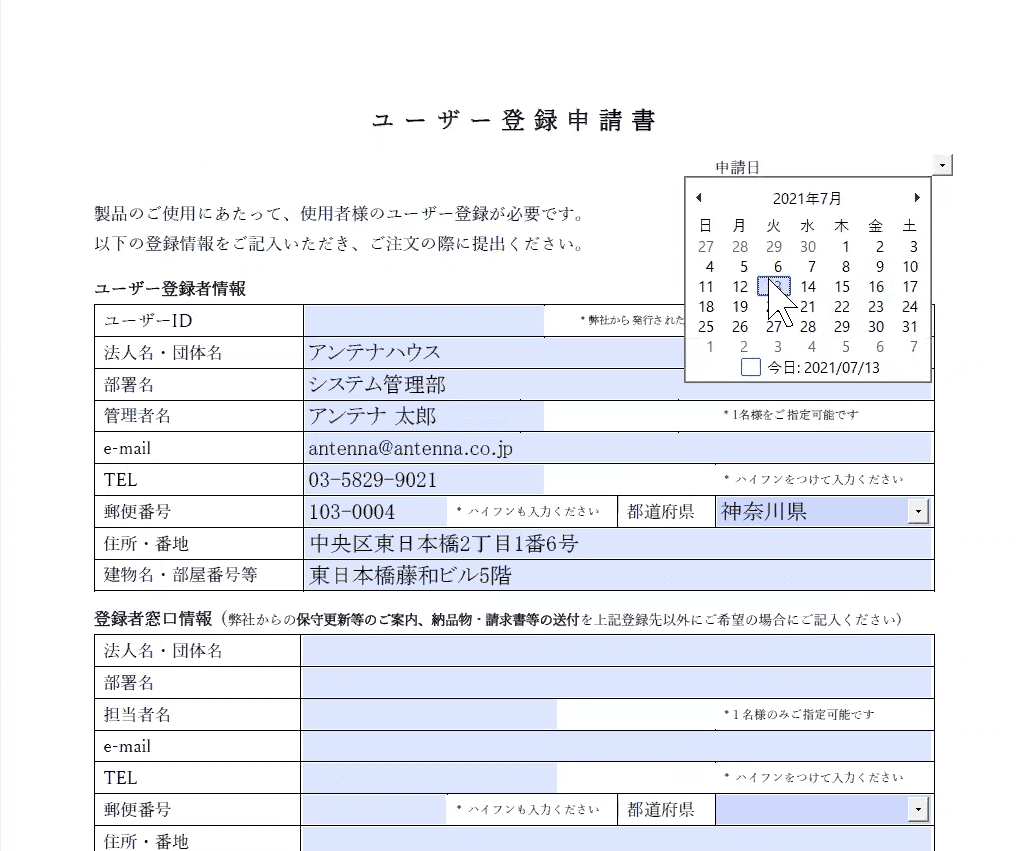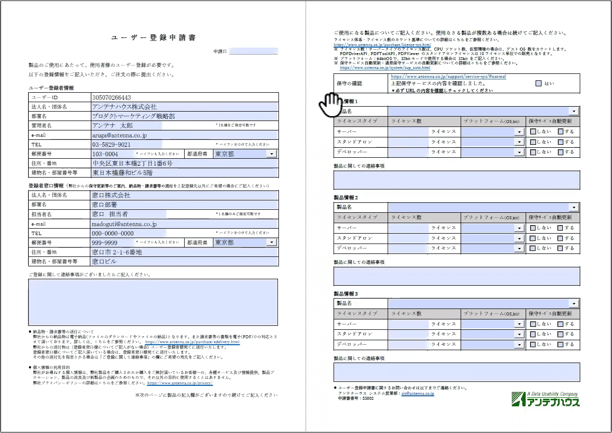 弊社ではソフトウェア製品のライセンス管理のために製品をご購入頂いた際にユーザー登録をしてもらっています。ユーザー登録の方法として申請書にユーザー情報と、使用する製品について記入頂いたものを提出いただいております。