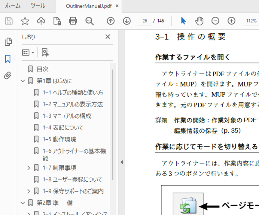 これは紙のマニュアルという体裁で作っておりますので、目次があって構造化されていて、「はじめに」、「機能概要」といった要素で構成されています。このPDFにはしおりがありません。ということで、今からしおりを作っていきます。