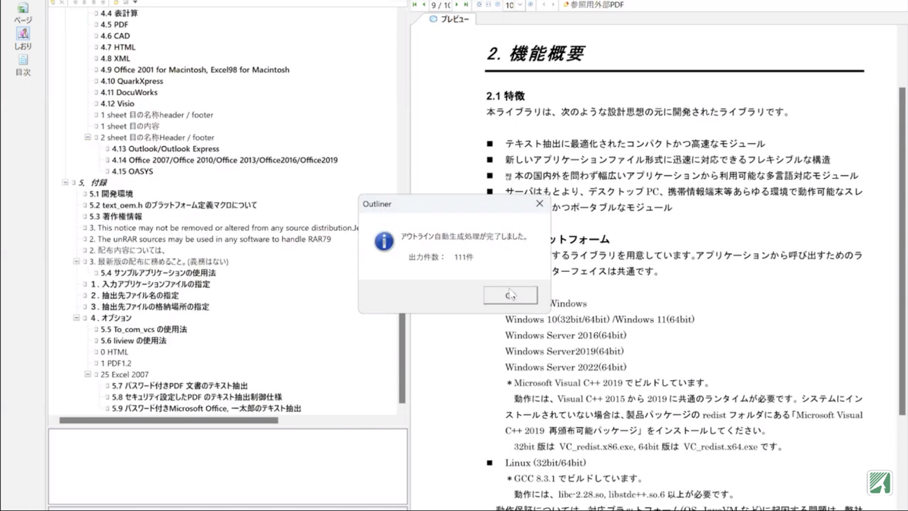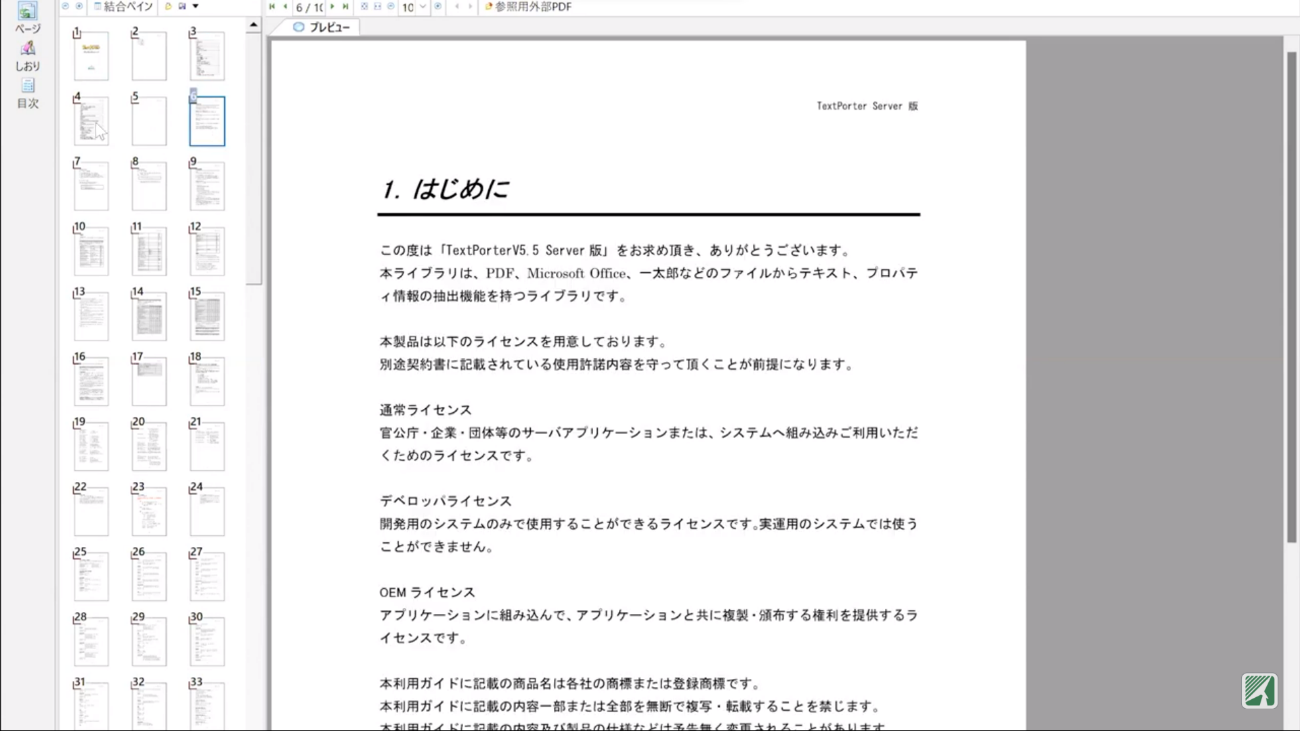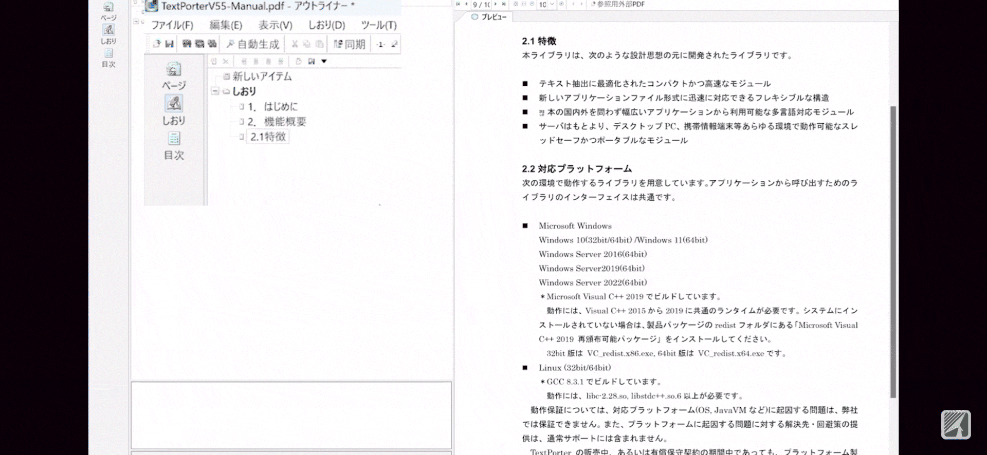 以下の画面は今回ご紹介するアンテナハウスの製品『アウトライナー』というソフトウェアで、おなじくアンテナハウスの製品である『TextPorter』のPDFマニュアルを開いたものです。Adobe Readerと比べるとビューアーの表示形式は異なりますが、見えている内容は同じです。