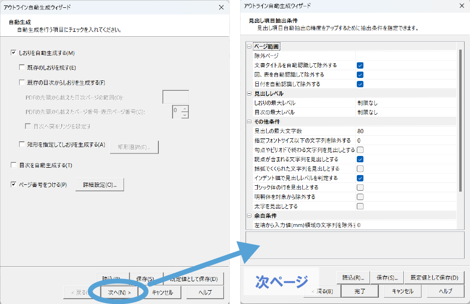 こちらのアウトライン自動生成ウィザードでは本文中を解析してしおりを作る際に精度をアップするための抽出条件を指定します。