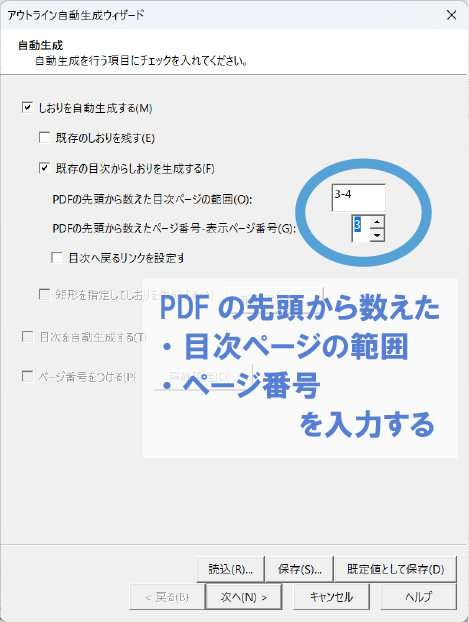 自動生成で既存の目次からしおりを生成します。設定内容は先ほどと同じです。その際、先ほど少し違う点があります。
