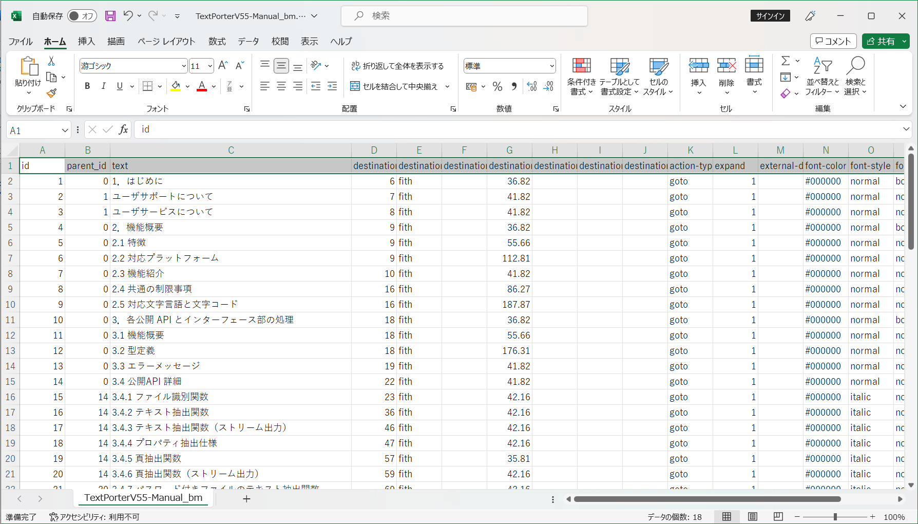 保存したCSVファイルをテキストエディタで開いてみます。しおりのテキスト情報と、しおりのとび先、今回はすべて同じPDF内のリンクですので、PDFのページと座標の情報が入っています。読み取りがうまくいっていない場合は空欄になっています。クリックしたときのアクション、ページ内移動なのか、外部ファイルを開くのかといった指定があります。