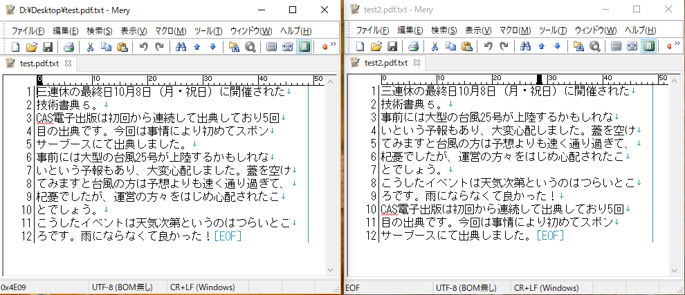 上図は、PDFビューアで「test.pdf」「test2.pdf」を並べてみた画像です。見る限り、両者には全く差がありません。しかし、これを全文コピー&ペーストしてみると、2つのPDFファイルから取り出したテキストの順番が違うことがわかります。