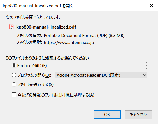FireFoxでは、ダウンロードを確認するダイアログがポップアップされ、この時に、PDFを表示するリーダーを選択してからダウンロードを開始します。