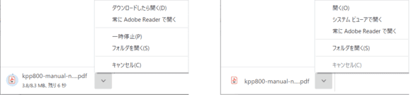 PDFをダウンロード確認するダイアログはブラウザによって異なっています。Google Chromeでは、左下にダウンロード中は進行中の表示(次図左)、ダウンロード完了するとクリック待ち(次図右)の状態となります。クリックすると、既定値ではChrome 内蔵のPDFリーダーで表示します。他のリーダーを選択することもできます。