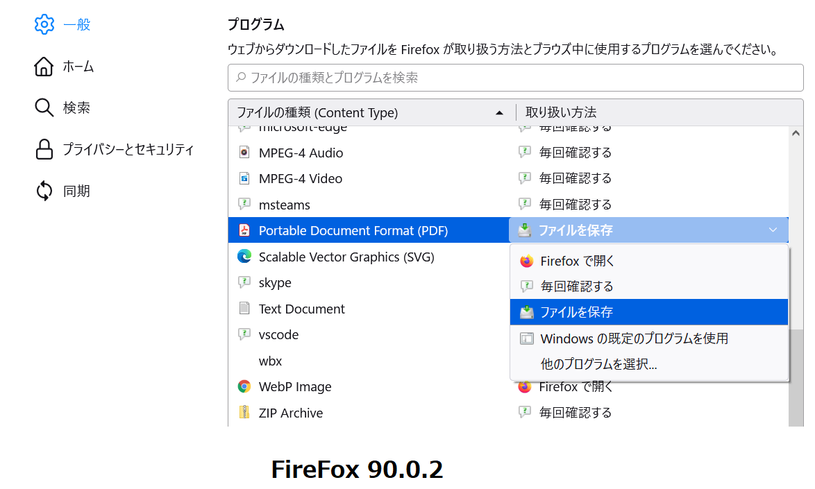 このためFireFoxでPDFをシームレスに表示するには、PDFファイルに対して「FireFoxで開く」を設定しておく必要があります。