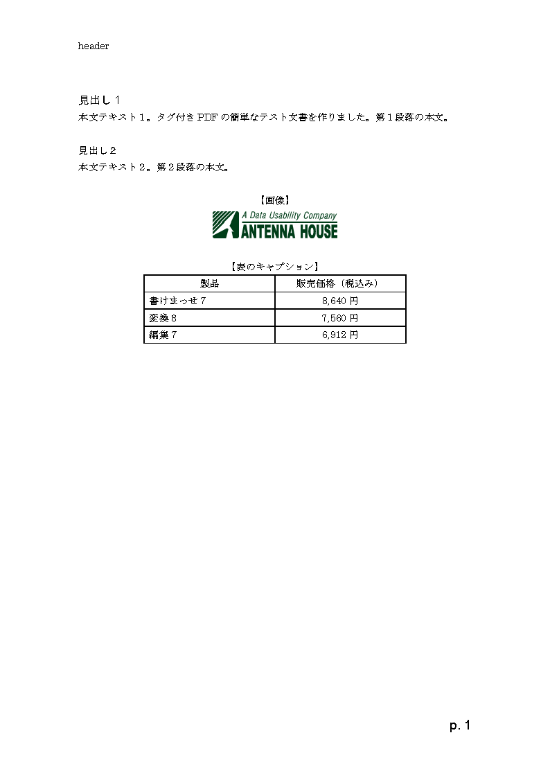 次のような1ページの簡単なPDFをタグ付きPDFにする例を示します。