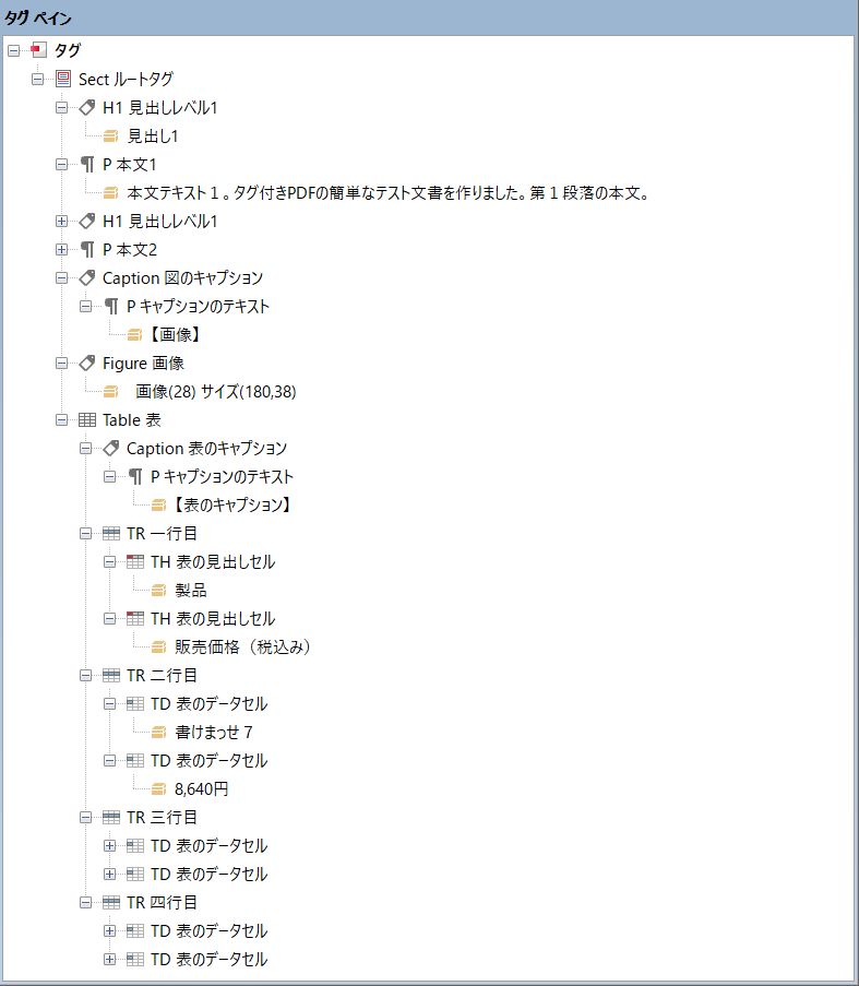 タグ付きPDFでタグツリーをどのように作るかは一意では無く自由度が高いです。ここではルートタグは、Sectとし、見出し1と本文、見出し2と本文、画像、表とキャプションの4ブロックがすべて兄弟関係と考えてタグを付けます。第一階層はすべてルートタグ(Sect)の子供とします。