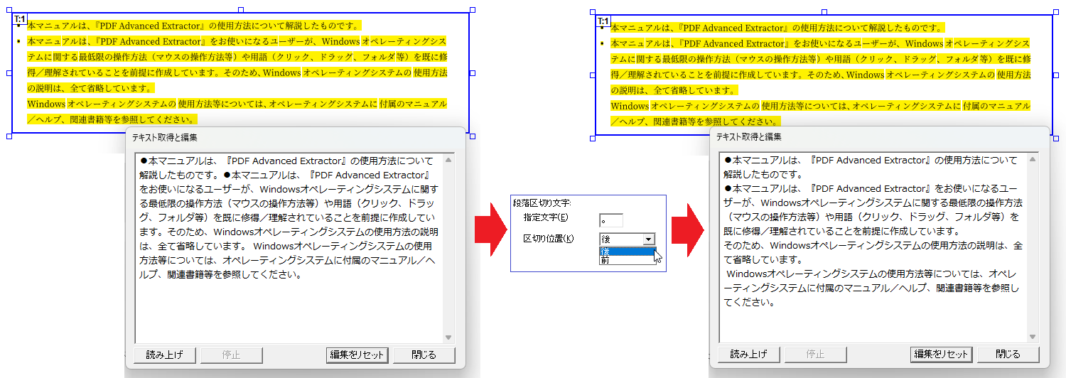 特定の文字または句読点の位置で改行を行いたい場合は、[オプション]で段落を区切る1文字または句読点と改行位置(対象文字の前後いずれか)を指定します。これにより、PDFに設定したテキスト枠全般について抽出結果の当該位置に改行コードを挿入できます。