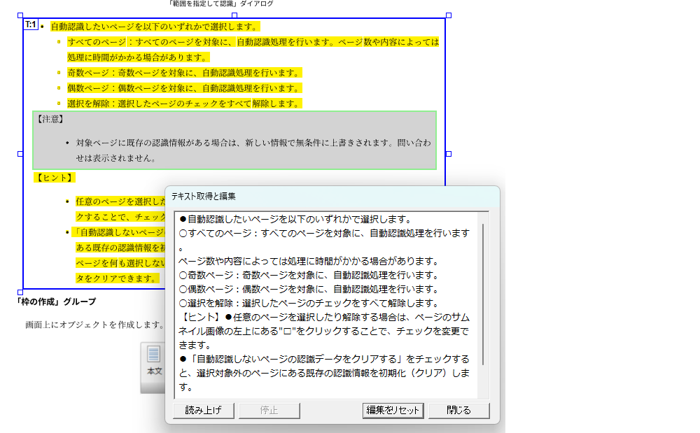 テキストに「見出し」枠を設定すると、抽出結果をHTMLタグ付きテキスト形式で保存する際に<h1>~<h6>の見出しタグに置き換えて出力できます。 一方、「見出し」枠を設定して抽出結果をプレーンテキストに保存した場合は、「見出し」枠の位置に”〓1:テキストデータ:1〓”という書式(数値は1~6の見出しレベル)で出力します。
