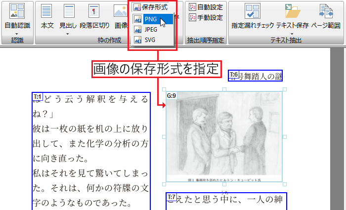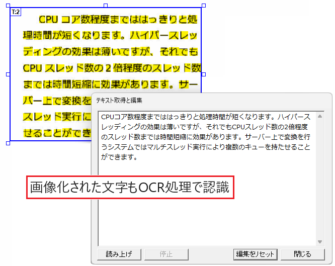 OCR処理により画像化された文字を認識して、通常のテキストデータと同様に抽出できます。