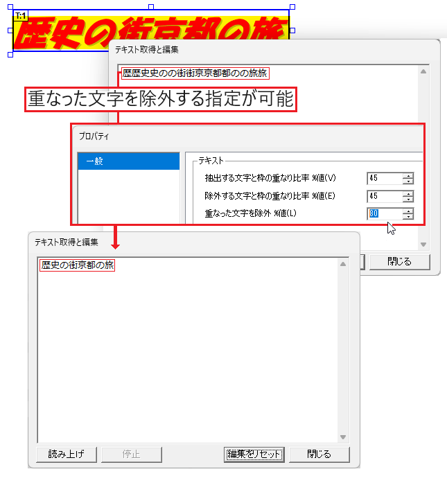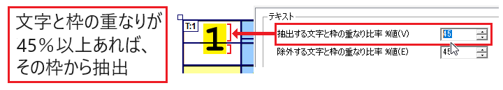 枠に対して文字の領域が重なる比率(%)を指定することにより、同じ文字が隣接する枠から重複して抽出されないようにします。