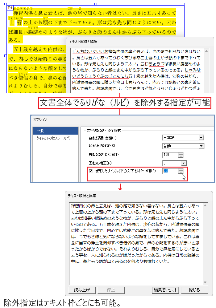 ふりがな(ルビ)や注釈文字など、テキスト抽出時に不要となる小さな文字を除外できます。