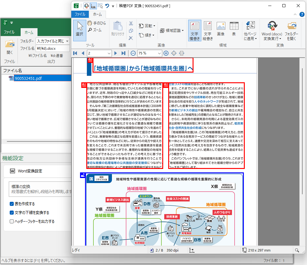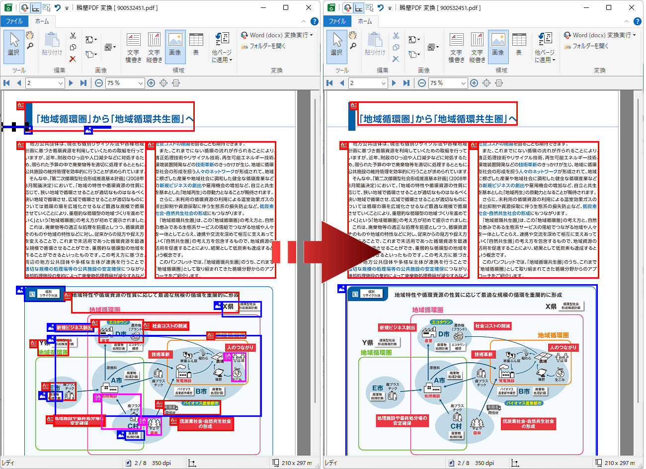 OCR処理では、画像を解析して横書き/縦書きのテキスト領域・表領域・画像領域を認識し、その結果を反映して変換を行います。しかし、画像の状態などから領域を誤認識してしまうとレイアウトが崩れて変換されるなど、期待通りの結果にならなくなります。
