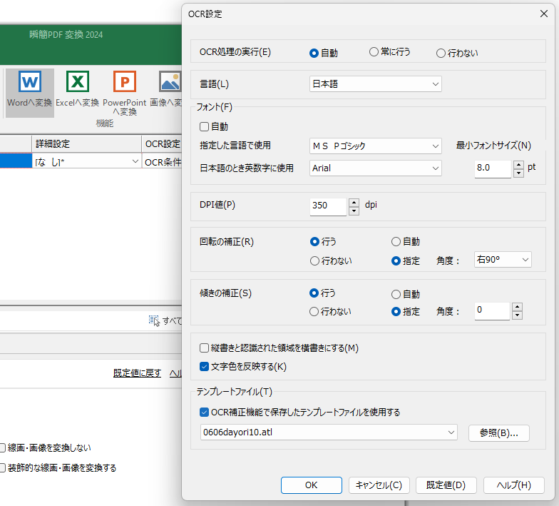 | OCR補正機能で保存したテンプレートファイルを使用する | OCR処理の対象にテンプレートファイルを適用して変換する場合に指定します。 |