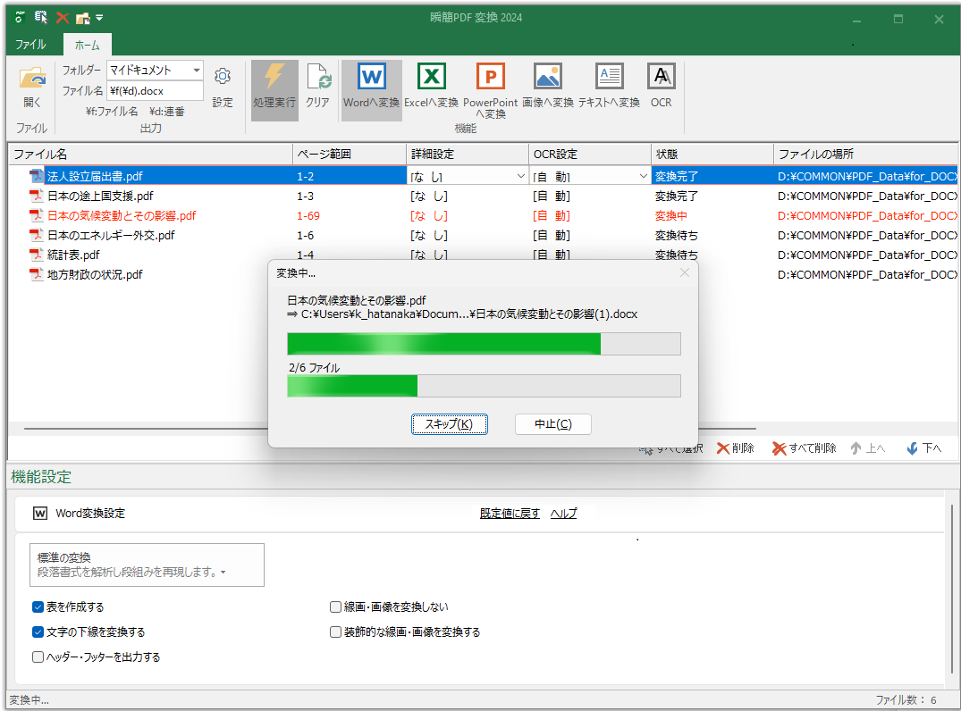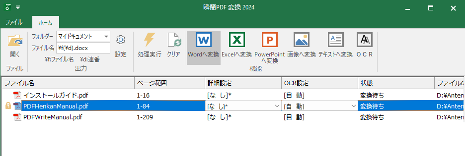 『瞬簡PDF 変換 2024』はリボン・インターフェースを新規に採用、簡単な操作でPDFや画像データをOffice文書に一括変換できます。