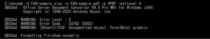 この例では、コマンドライン起動時に、-extlevel 4 を指定しているので、警告レベルのエラー(2)が発生しても正常終了してPDFファイルが出力されます。