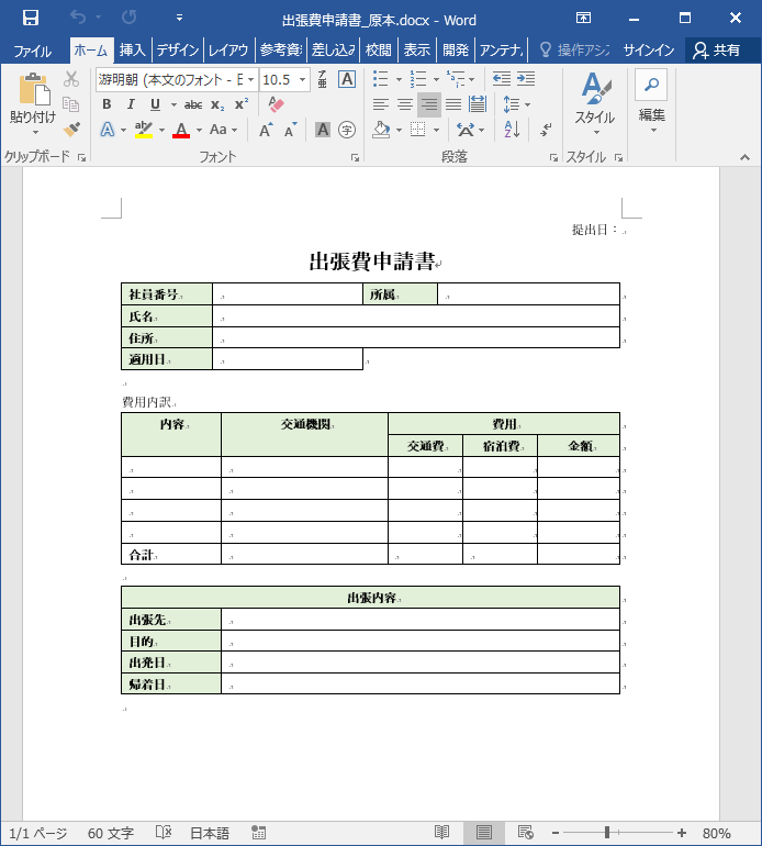 上図のテンプレートファイルの例では [提出日:] の部分が段落でラベル(項目)のみで定義されます。他のテーブルが表と定義されます。表はラベルと入力欄の形式により次の3つのタイプに分類されます。