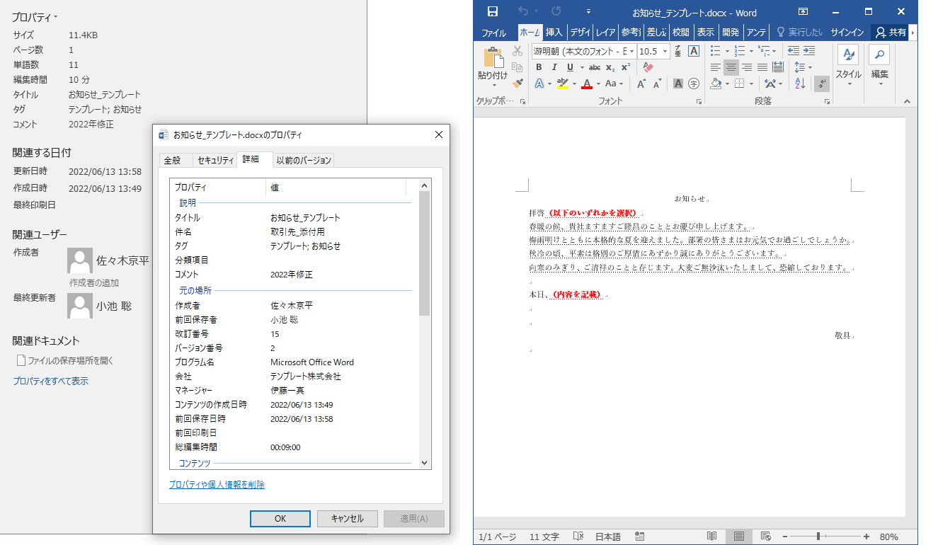 『Word API』でWord文書にプロパティ、個人情報、隠し文字が設定されているかを検査し結果を取得、対象情報を指定した削除をする機能についてサンプルファイルを使用して紹介します。サンプルファイルはインストール先のディレクトリ内に格納されています。