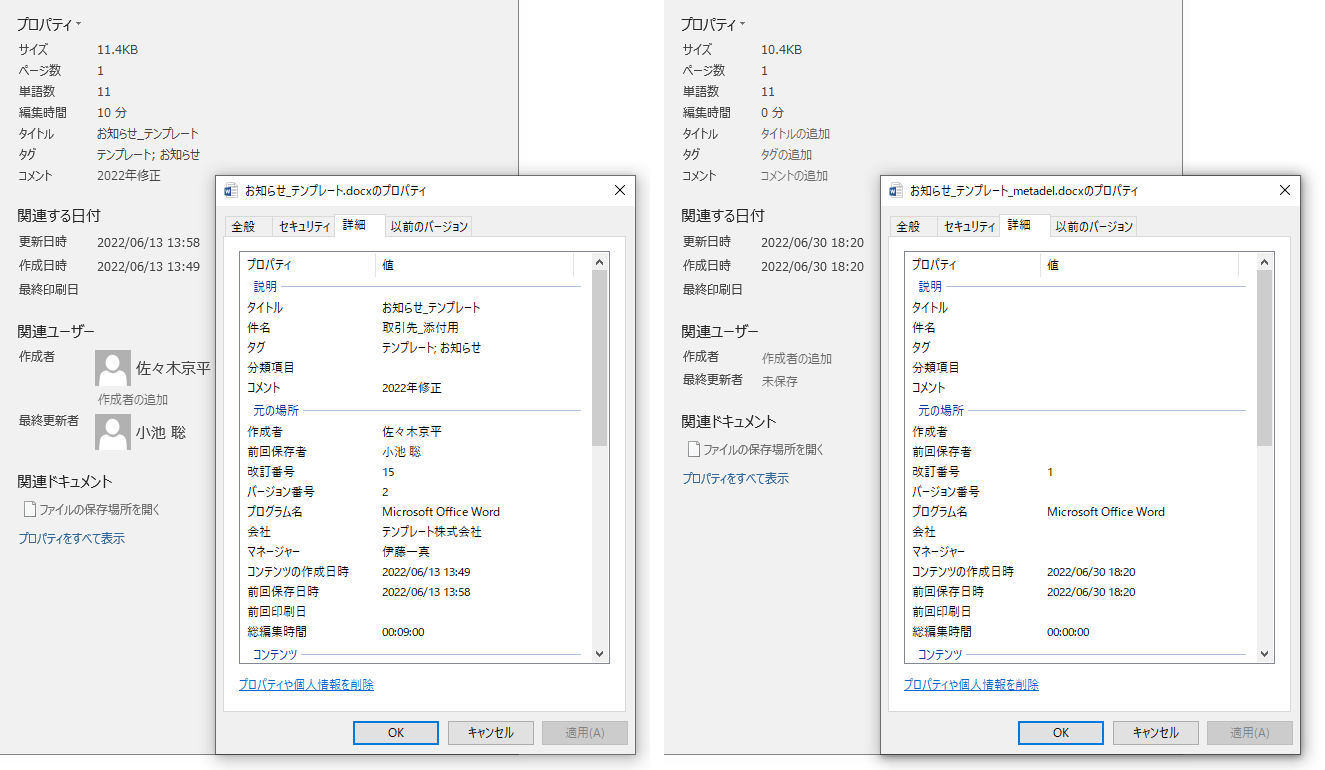 『Word API』ではWord文書に設定されている作成日時・更新日時などの"プロパティ情報"、作成者・更新者などの"個人情報"、"隠し文字"をメタ情報として分類します。